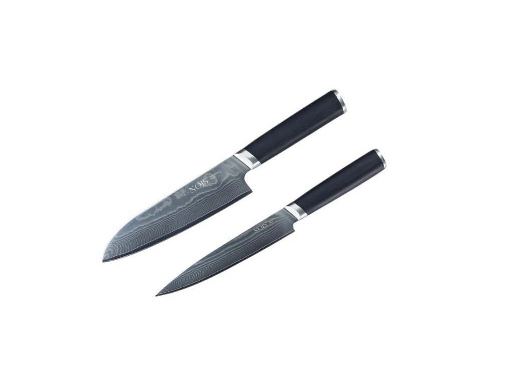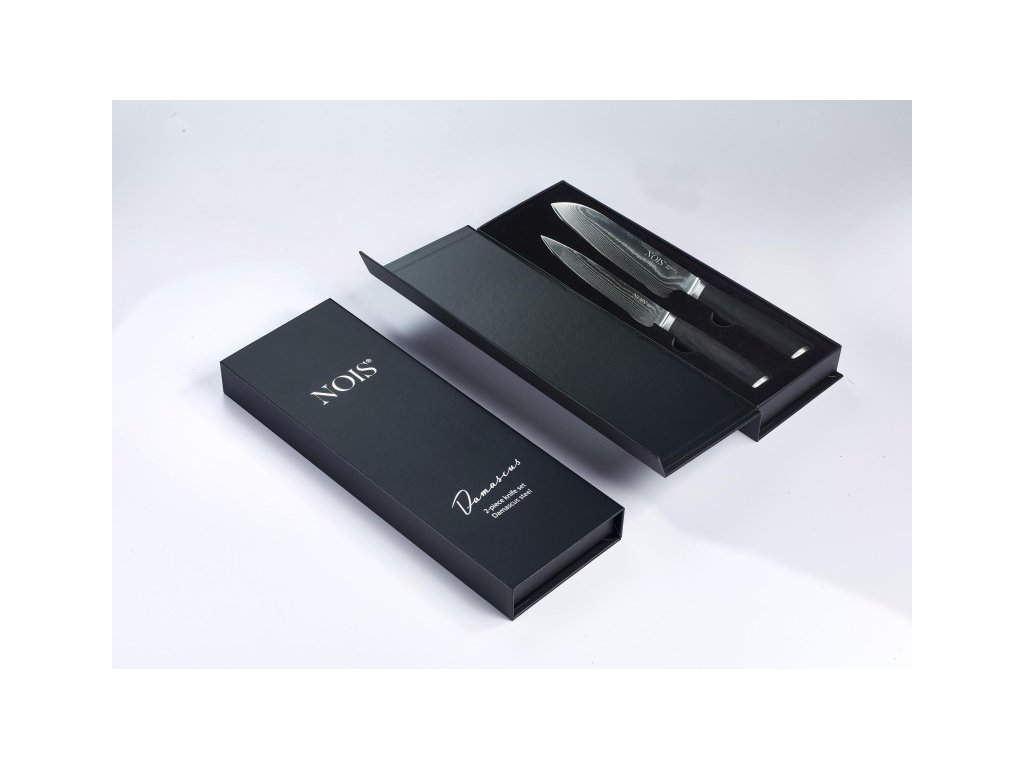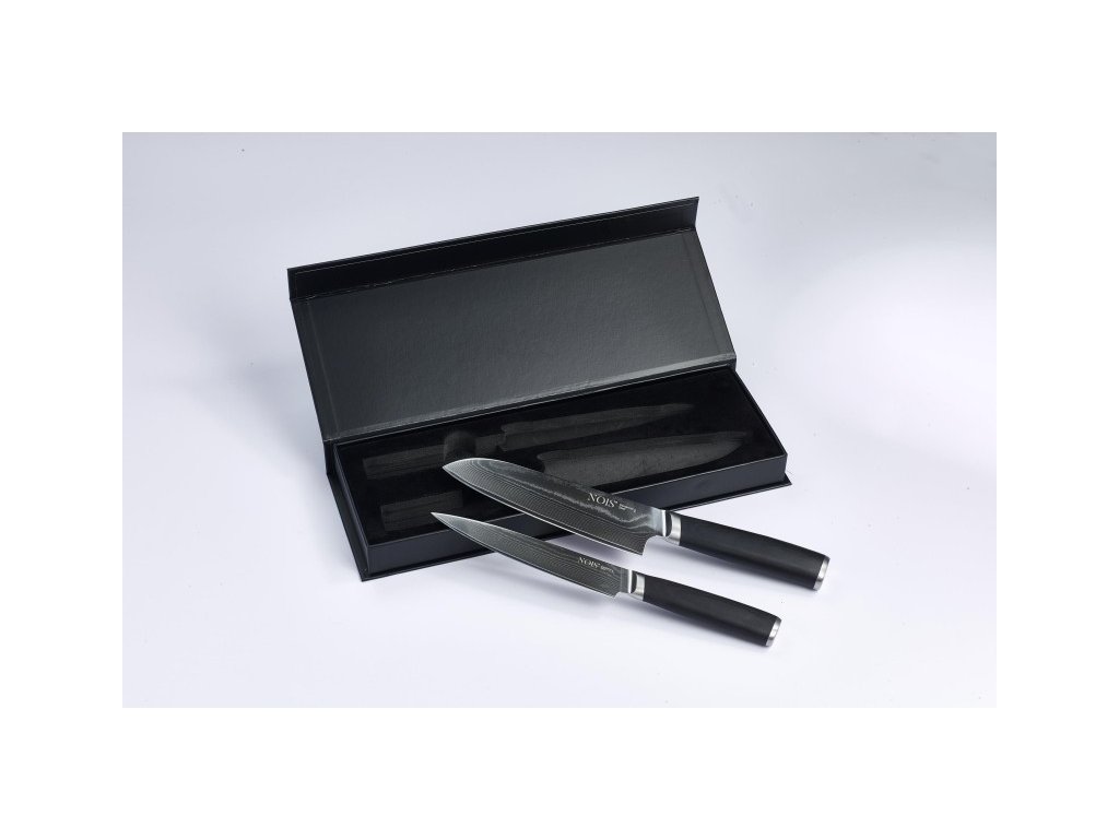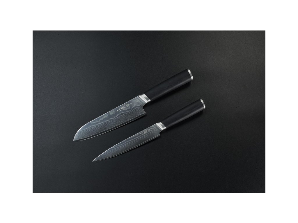 Táto dvojdielna sada nožov je vyrobená zo 67 vrstiev vysoko kvalitnej damaškovej ocele. Nože ponúkajú výnimočnú ostrosť a neuveriteľnú odolnosť. Sú ideálne na každodenné použitie v kuchyni a môžu sa pochváliť tvrdosťou 60 +/- 1 HRC. Vďaka pokročilej technológii brúsenia vodou má každý nôž charakteristický damaškový vzor, ktorý spája krásu s vynikajúcou kvalitou rezu.