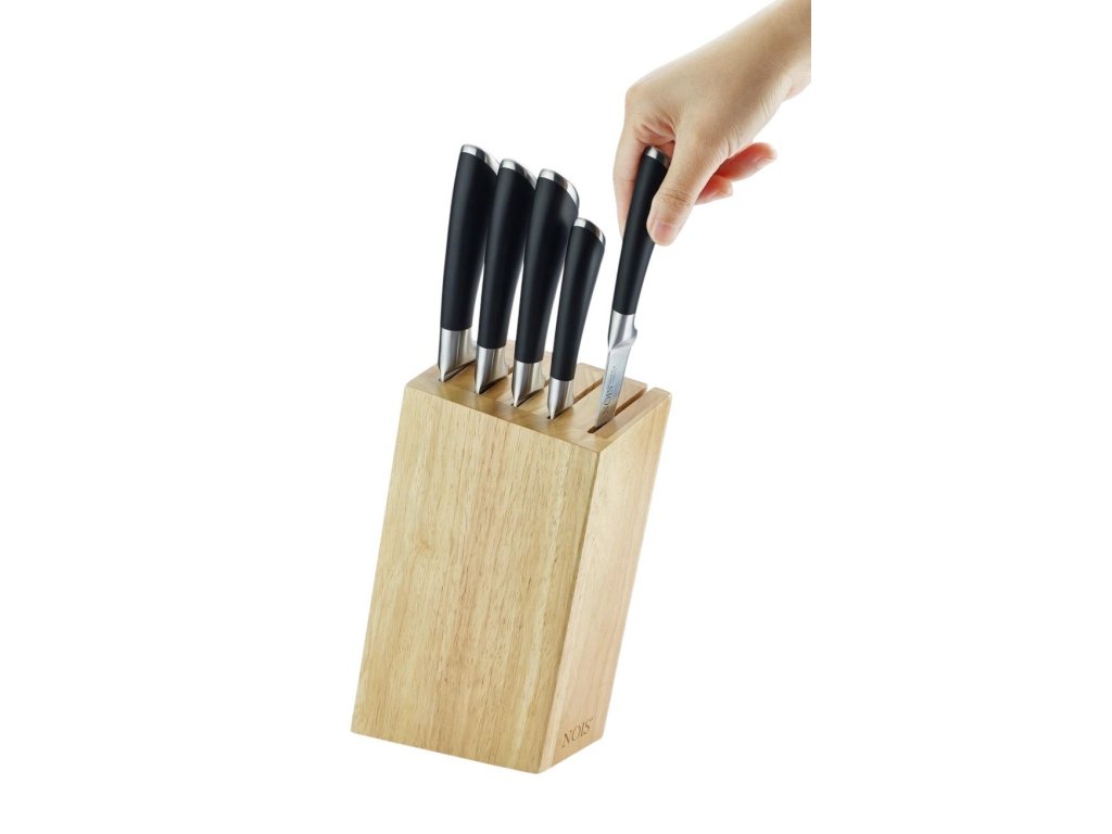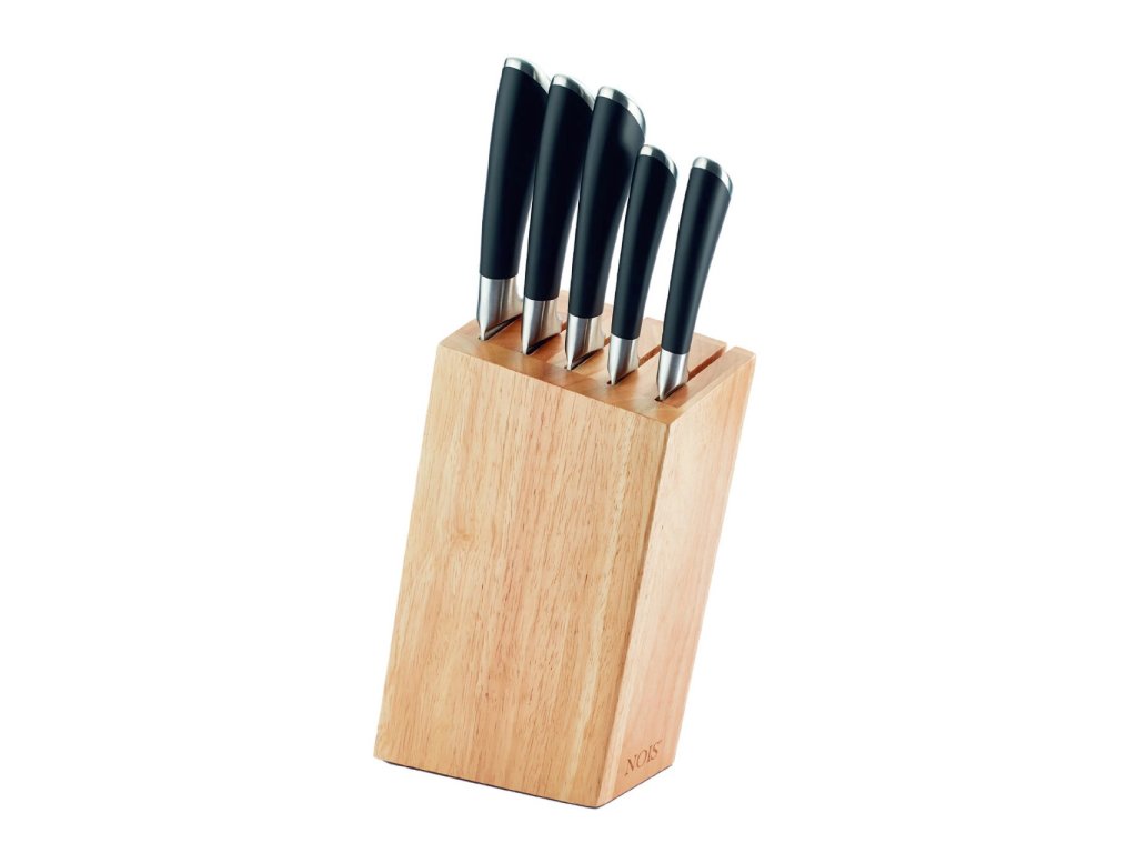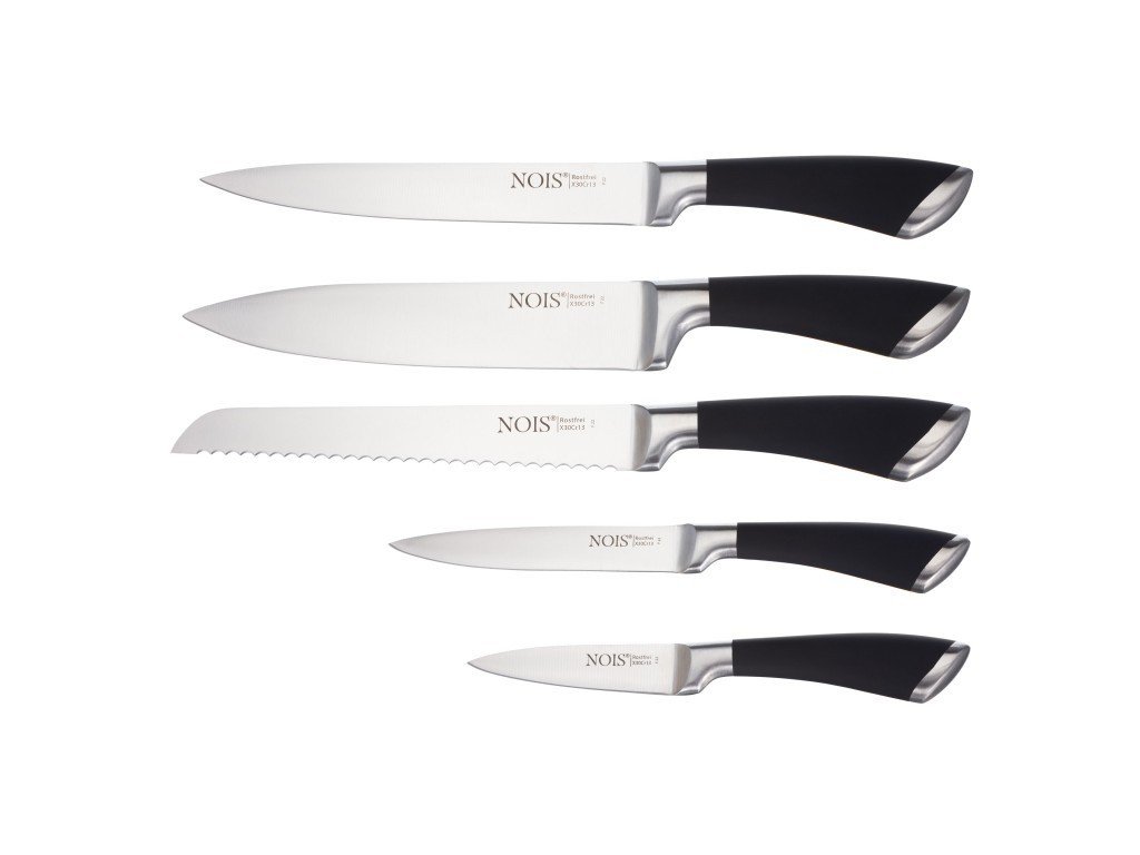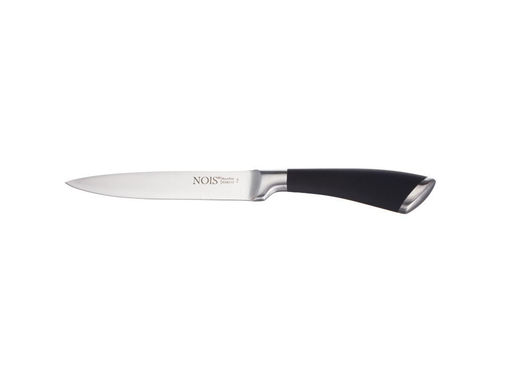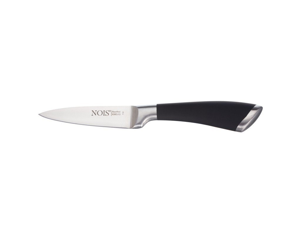 Súprava nožov LIBRA od "NOIS" pozostáva z praktických a štýlových nožov, ktoré vám pomôžu pripraviť chutné raňajky, obed aj večeru. Nože sú vyrobené z valcovanej nerezovej ocele X30CR13 (obsahujúcej 13% chrómu) s tvrdosťou 52 +/-2 HRC. Dizajn a tvar noža zaisťujú jednoduché používanie. Ostrá a tenká čepeľ ľahko prereže produkty rôznej tvrdosti. Hladký, starostlivo leštený povrch čepele umožňuje presné rezanie bez deformácie výrobkov. V mieste, kde sa čepeľ stretáva s rukoväťou, sa nehromadia baktérie a nečistoty. Zhrubnutie medzi čepeľou a rukoväťou noža poskytuje bezpečnú oporu pre ukazovák a tiež zlepšuje rovnováhu, čo umožňuje dlhú prácu bez únavy. Nože sa ľahko brúsia.