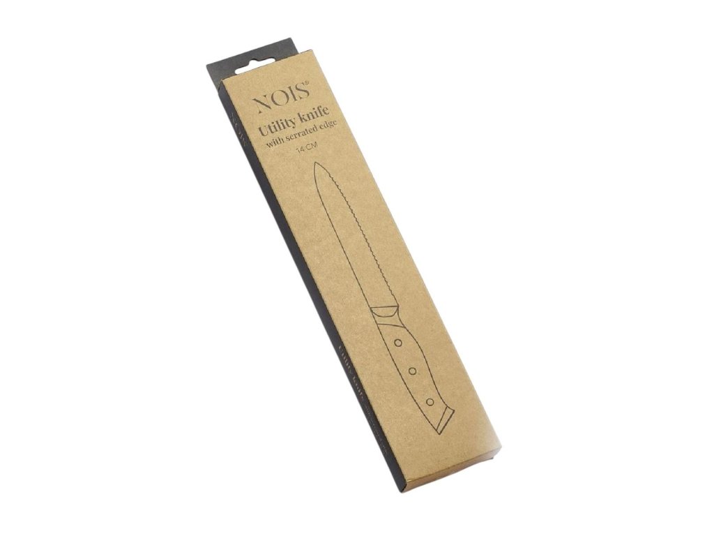 Nôž univerzálny zúbkatý „NOIS“ je vyrobený z valcovanej nehrdzavejúcej ocele X50CrMoV15 s tvrdosťou 55 +/- 1 HRC. Dizajn a tvar noža zaisťujú jednoduché používanie. Ostrá, tenká čepeľ ľahko reže potraviny rôznej tvrdosti. Hladký, starostlivo leštený povrch čepele umožňuje presné rezanie bez deformácie potravín. Miesto, kde sa čepeľ stretáva s rukoväťou, zabraňuje hromadeniu baktérií a nečistôt. Hrebeň medzi čepeľou a rukoväťou poskytuje bezpečnú oporu pre ukazovák a zlepšuje rovnováhu, čo umožňuje dlhú prácu bez únavy. Tento nôž sa ľahko ostrí.